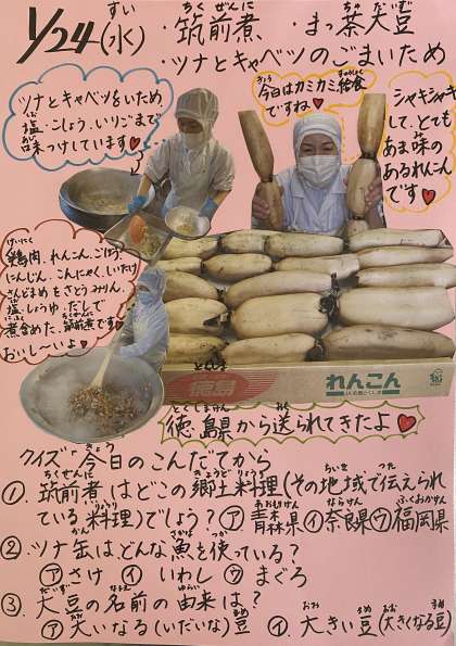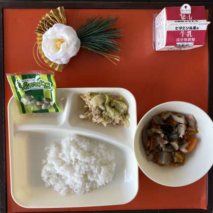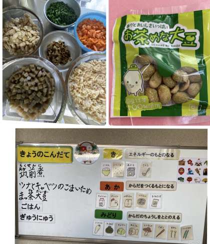 今日の給食の献立は、筑前煮、ツナとキャベツのごまいため、まっ茶大豆、ごはん、牛乳でした。