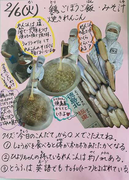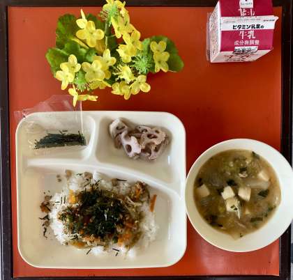 今日の給食の献立は、鶏ごぼうご飯、みそ汁、焼きれんこん、牛乳でした。