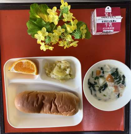 今日の給食の献立は、ほうれんそうのクリームシチュー、キャベツのサラダ、デコポン、黒糖パン、牛乳でした。