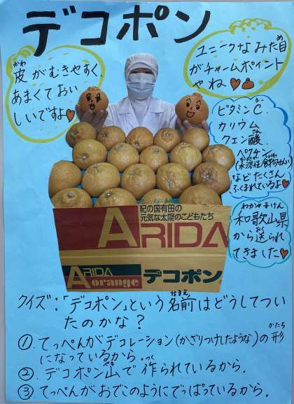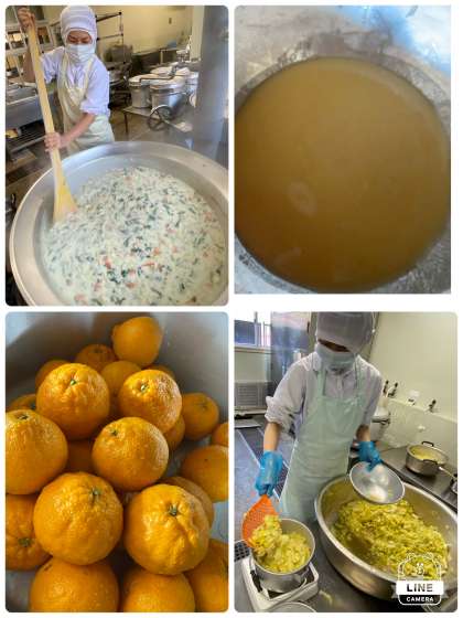 給食に登場する柑橘類は、あまなつかん、いよかん、オレンジ、かわちばんかん、デコポン、はっさく、みかん、ゆず、レモンです。(ゆず、レモンは果汁をあえものなどに使います。)
