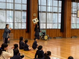 今日の集会は、「ならべかえゲーム」でした。ばらばらに並んだ文字を見て、並べ替えて文字を見つけます。一番難しい問題は、「かいてんもくば」でした。