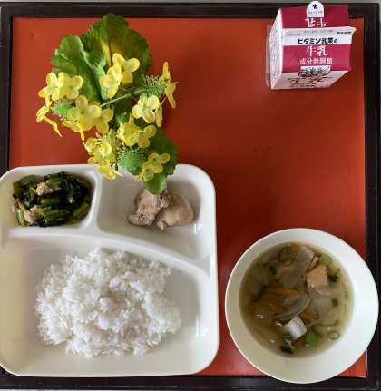 今日の給食の献立は、鶏肉のなにわ甘辛ソースかけ、船場汁、こまつなの炊いたん、ごはん、牛乳でした。