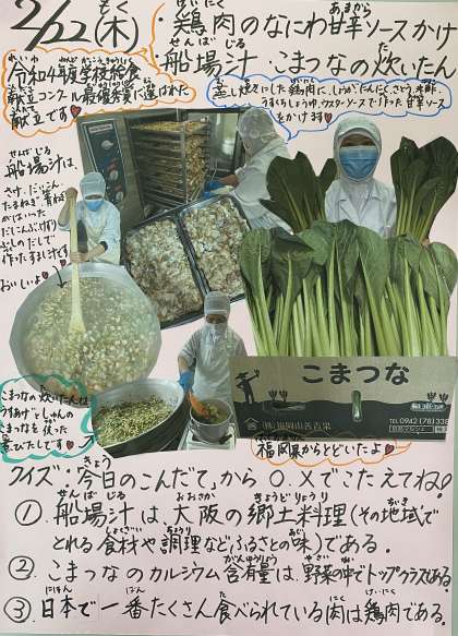 今日の献立は、学校給食献立コンクール最優秀賞作品で、中央区開平小学校の児童が考えた作品です。ねらいは、「大阪の問屋街である船場で生まれた船場汁など、私たちの住んでいる地域に関りある献立を考えました」です。