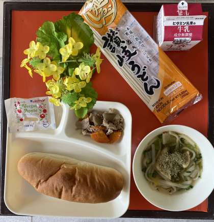甘辛いあげと、とろろこんぶ(袋入り)を上にかけた「なにわうどん」は、子どもたちや教職員にも大人気でした。