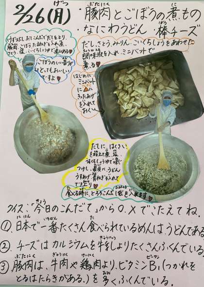 今日の給食の献立は、豚肉とごぼうの煮もの、なにわうどん、棒チーズ、コッペパン、りんごジャム、牛乳でした。