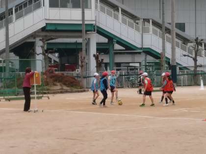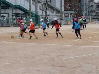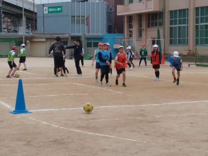 ボールけりゲームで体を動かしました。積極的にボールを追いかけています。