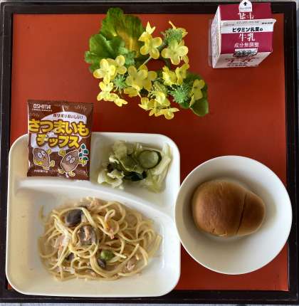 今日の給食の献立は、さけのクリームスパゲッティ、キャベツときゅうりのサラダ、おさつチップス、1/2黒糖パン、牛乳でした。