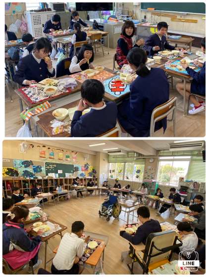 今日も、6年生と低学年の交流給食で、6年生のお兄ちゃん、お姉ちゃんと一緒に給食を食べている低学年のクラス子どもたちはとてもうれしそうでした。食べた後、6年生がクイズなどして盛り上がっていました。😊