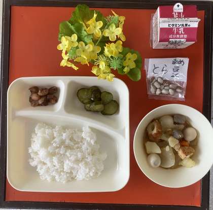 今日の給食の献立は、関東煮、きゅうりの梅風味、とら豆の煮もの、ごはん、牛乳でした。