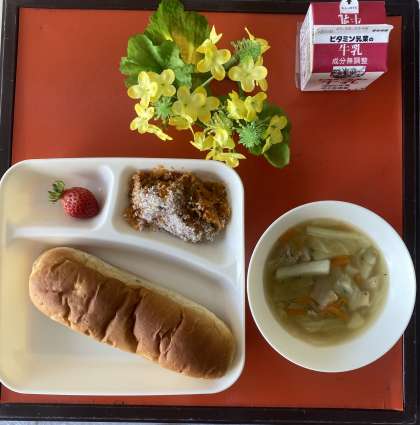 今日の給食の献立は、とうふのミートグラタン、じゃがいもと野菜のスープ、いちご、おさつパン、牛乳でした。