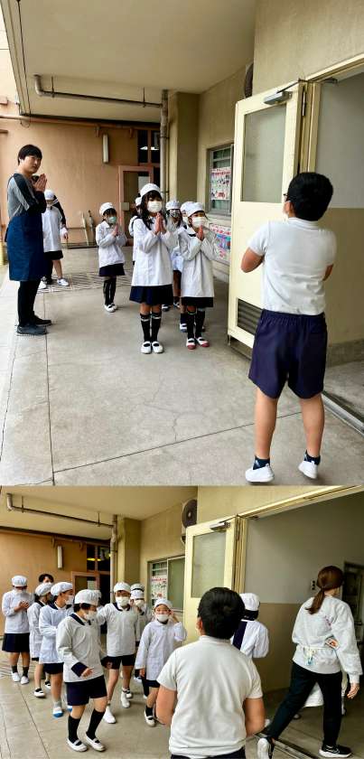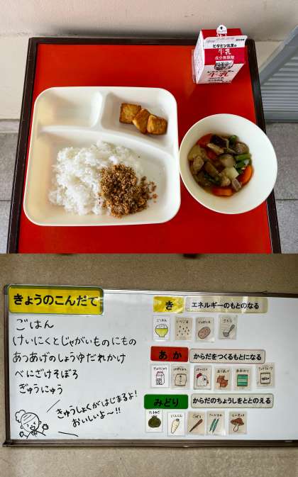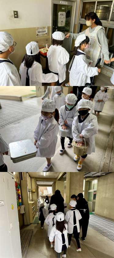 1年生は初めての給食でした。ドキドキしながら給食の準備をしましたが、食べ始めると「おいしい」とニコニコの1年生でした。