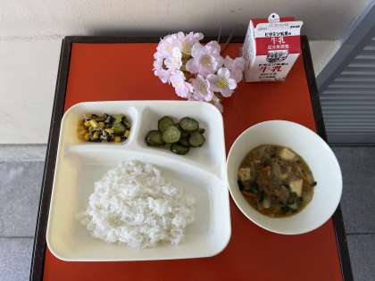 4月12日(金)の給食は、ごはん、マーボーどうふ、きゅうりの中華あえ、ツナとチンゲンサイのいためもの、牛乳でした。
