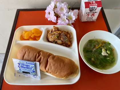 きょうの献立は、コッペパン、じゃがいものミートグラタン、レタスのスープ、みかん(缶)、ブルーベリージャム、牛乳でした。