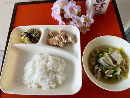 きょうの献立は、ごはん、鶏肉のからあげ、中華スープ、チンゲンサイともやしの甘酢あえ、牛乳でした。