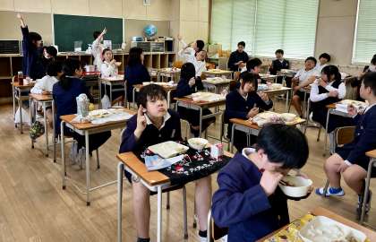 2枚目の写真は、給食当番が献立を読み上げているところです。