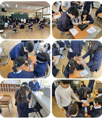 1年生が端末開きをしました。九条東小学校のリーダー6年生が来てくれて、電源のつけ方やID・パスワードの入れ方など、優しくていねいに教えてくれました。1年生も6年生の話をよく聞いて、上手に入力することができました。みんなこれから端末をどのように使っていくのか楽しみにしているようでした。