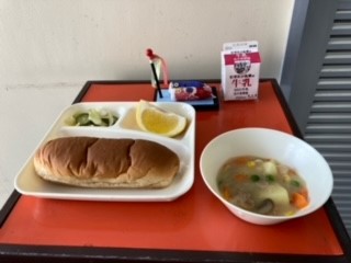 今日の献立は、パン、鶏肉とコーンのシチュー、キャベツときゅうりのサラダ、かわちばんかん、牛乳でした。