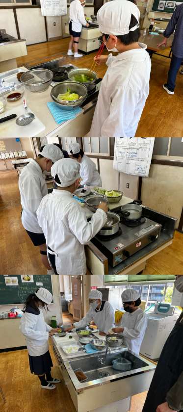 5・6時間目、5年生は調理実習をしました。「ゆで野菜サラダ」とつくりました。