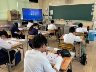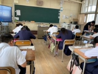 英語のテストをしていました。英語を聞いて答える問題が多く、難しいです。