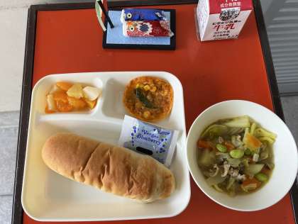 きょうの献立は、コッペパン、豚肉と野菜のカレースープ煮、変わりピザ、ミックスフルーツ(缶)、ブルーベリージャム、牛乳でした。