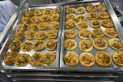変わりピザは、ぎょうざの皮に、ツナ、コーン、ピーマン、ピザソース、チーズを混ぜ合わせた具をのせて、焼き物機で焼いています。