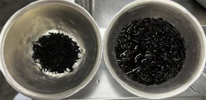 2枚目の写真は、乾燥したひじきと水で戻したひじきで、どちらも同じ量です。