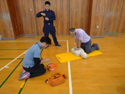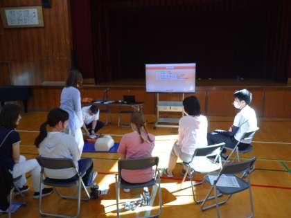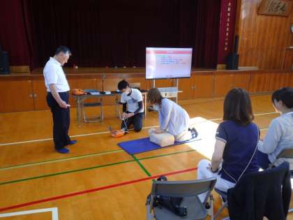 今年も西消防署の救急隊員の方々に来て頂き、心肺蘇生法の講習を受けました。保護者の方々にもご参加頂きました。