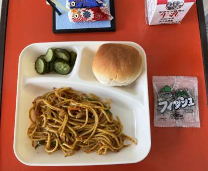 きょうの献立は、ミニコッペパン、カレースパゲッティ、きゅうりのピクルス、ミニフィッシュ、牛乳でした。
