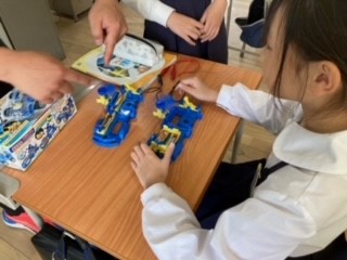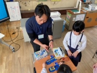 電池のつなぎ方を変えて、モーターの動く速さを比べる実験をしていました。