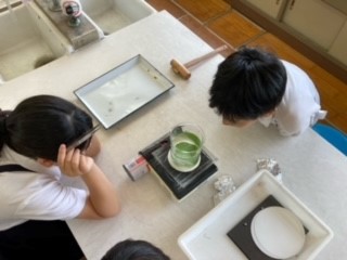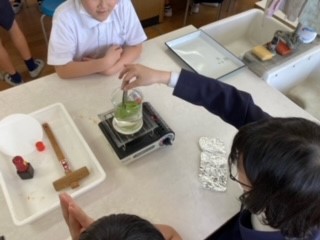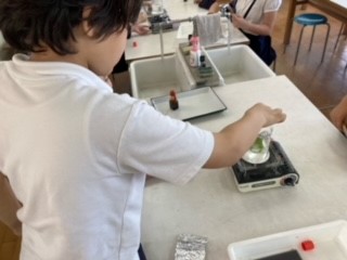 日光に当てた葉と当てなかった葉をとって、でんぷんがあるかどうかを調べる実験です。