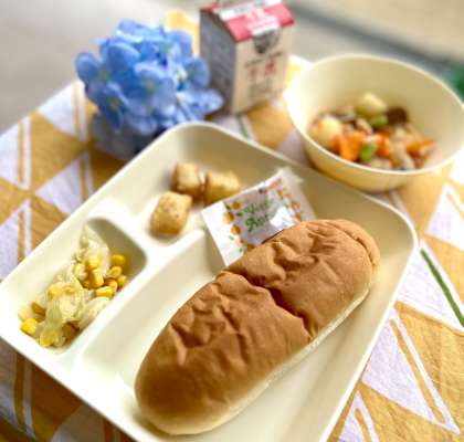 きょうの献立は、コッペパン、いかてんぷら、フレッシュトマトのスープ煮、キャベツとコーンのサラダ、アプリコットジャム、牛乳でした。