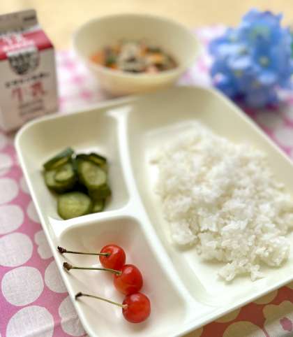 きょうの献立は、ごはん、牛肉と野菜のいため煮、きゅうりのしょうがづけ、さくらんぼ、牛乳でした。