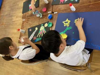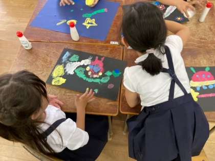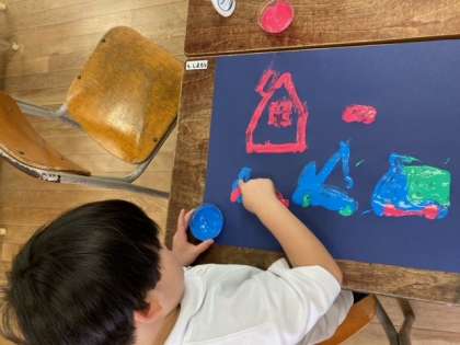 指先に色をつけて、絵をかきました。楽しそう。