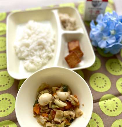 きょうの献立は、ごはん、八宝菜、あつあげのピリ辛じょうゆかけ、もやしの中華あえ、牛乳でした。