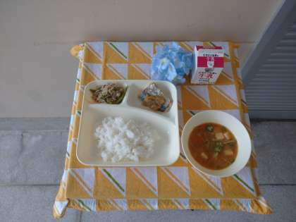 本日の献立は、さごしのおろしじょうゆかけ、みそ汁、野菜いため、ごはん、牛乳です。