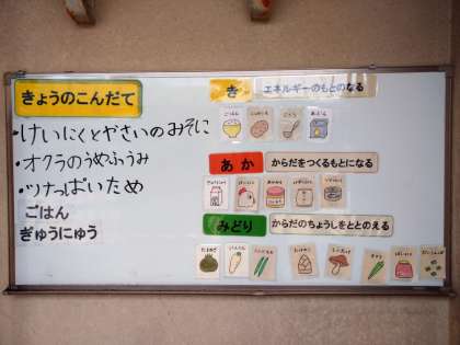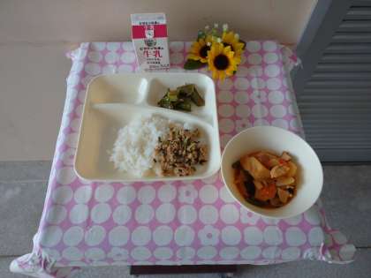 本日の献立は、鶏肉と野菜のみそ煮、オクラの梅風味、ツナっ葉いため、ごはん、牛乳です。