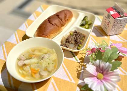 きょうの献立は、おさつパン、牛肉のソース煮、スープ、きゅうりのピクルス、牛乳でした。