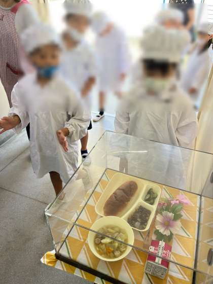 2枚目の写真は、給食当番が給食の見本を見ていることろです。