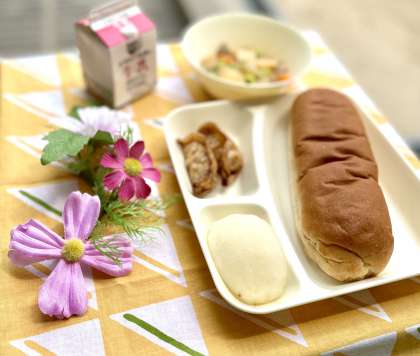 きょうの献立は、黒糖パン、あげギョーザ、鶏肉ととうがんの中華煮、なし(豊水)、牛乳でした。