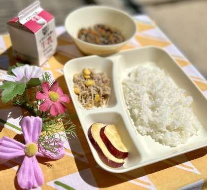 きょうの献立は、ごはん、マーボーなす、ツナと野菜のいためもの、焼きさつまいもの甘みつかけ、牛乳でした。