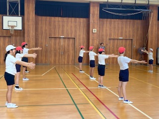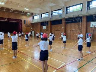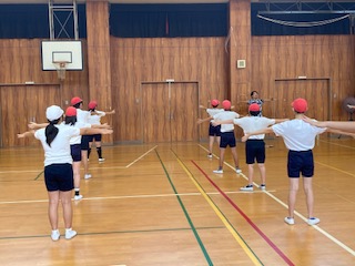 運動会に向けて、表現運動の練習です。自分の位置を意識しながら全体の動きを確認しました。