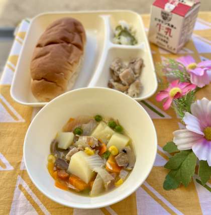 きょうの献立は、黒糖パン、鶏肉のバジル焼き、ベーコンと野菜のスープ煮、キャベツときゅうりのサラダ、牛乳でした。