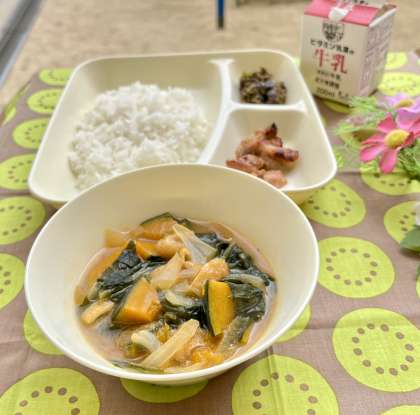 きょうの献立は、ごはん、鶏肉のてり焼き、かぼちゃのみそ汁、なすのそぼろいため、牛乳でした。