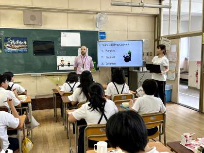 給食時間は「なす」についてのクイズを、シェーン先生といっしょにおこないました。