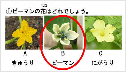 いつもは野菜の花をよく覚えている子どもたちですが、きょうのピーマンの花クイズはすこし難しかったようでした。