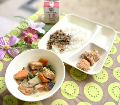 きょうの献立は、ごはん、鶏肉のたつたあげ、あつあげと野菜の煮もの、おかかなっ葉、牛乳でした。