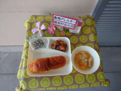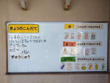 今日の給食は、なすのミートグラタン、鶏肉とキャベツのスープ、ミニフィッシュ、加工パン、牛乳です。