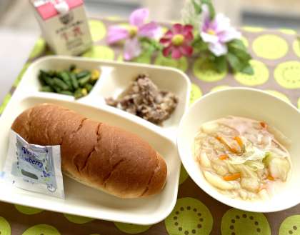 きょうの献立は、黒糖パン、豚肉のガーリック焼き、鶏肉と野菜のスープ、さんどまめとコーンのソテー、ブルーベリージャム、牛乳でした。