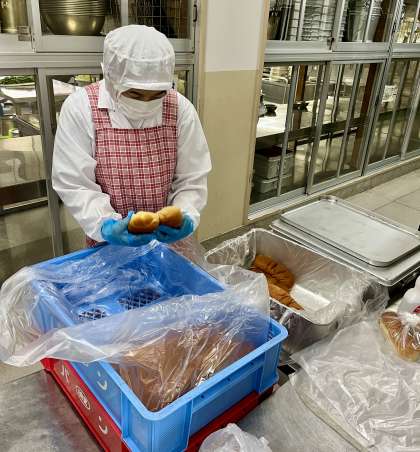 給食室でパンを検品しながらクラスごとに分けている様子を見ました。エプロンがいつもと違うことに気づいている子もいましたよ。パン専用のエプロンです。