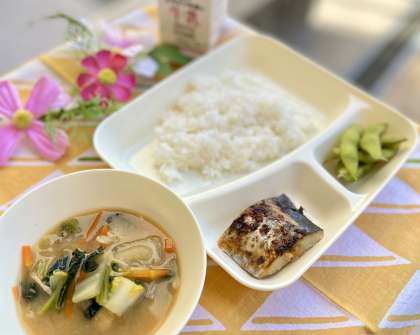 きょうの献立は、ごはん、さごしの塩こうじ焼き、みそ汁、えだまめ、牛乳でした。